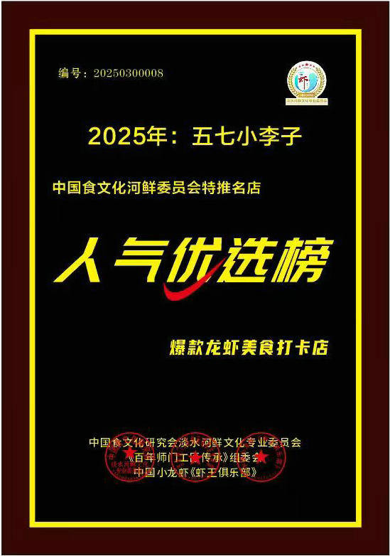 2024年3月 潜江市五七小李子餐饮管理有限公司在《风溜宴渔杯》2024年第六届中国小龙虾烹饪艺术创新大赛中被中国水产流道加工协会、小龙虾产业分会、中国食文化研究会淡水河鲜文化专业委员会、中国小龙虾《虾王俱乐部》、中国食材电商节组委会评为“中国十大品牌龙虾店”