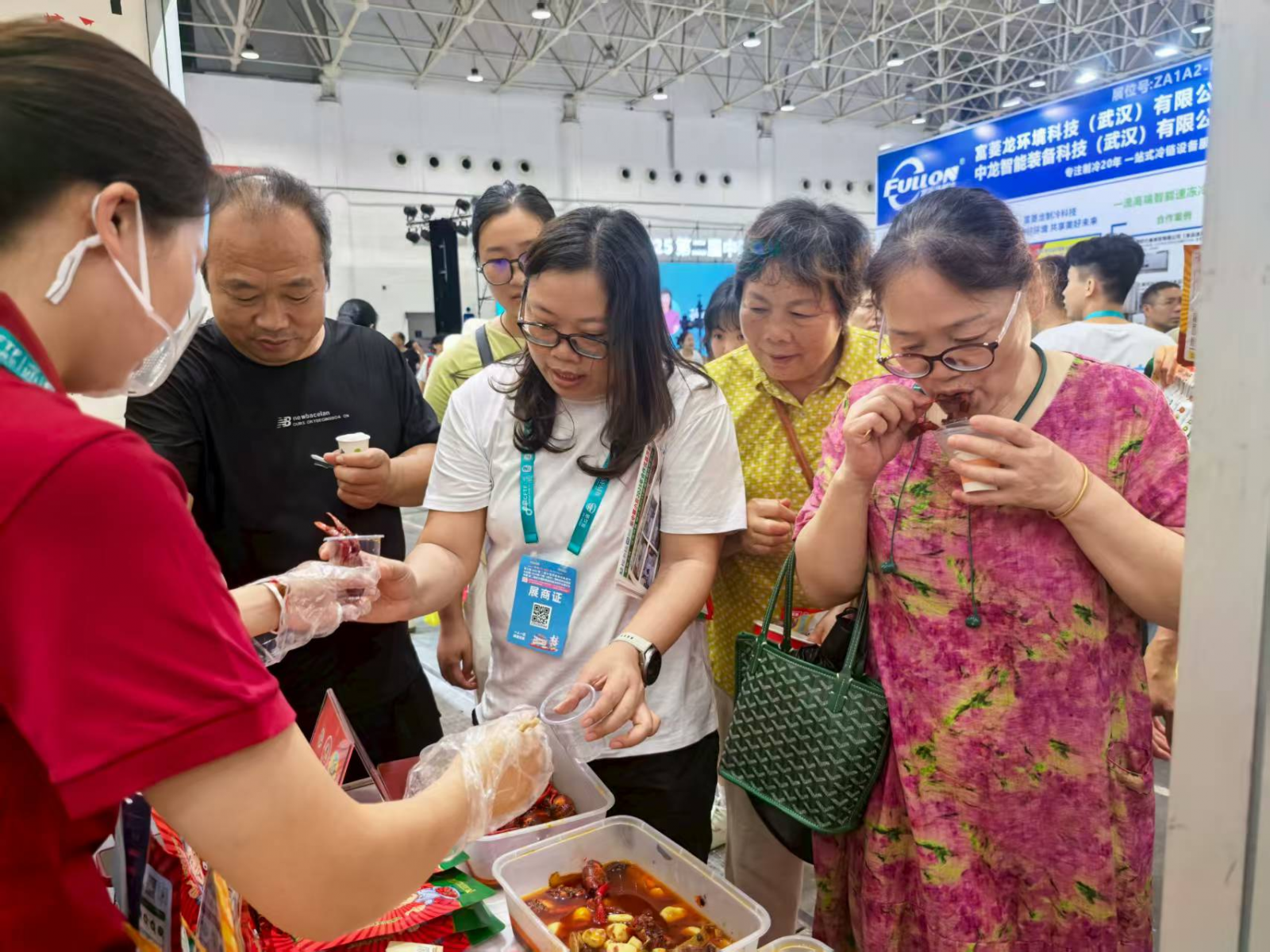 清晨的武汉世博会人潮涌动,来自全国各地的餐饮从业者、食材供应商和美食爱好者齐聚一堂。本届电商节聚焦早餐食材领域,汇聚了全国七百多家食材、机械供应商,为早餐产品创新和供应链升级提供了重要平台。在这场美食盛宴中,潜江五七小李子油焖大虾的展位前早早排起了长队。许多参观者被那阵阵飘香所吸引,专程前来品尝这道享有盛名的非遗美食。