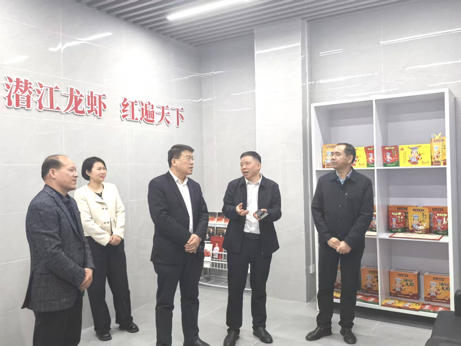 江汉艺术职业学院党委副书记、院长程伦嵩与油焖大虾创始人李代军热情接待了冯家欣主席一行,并就潜江龙虾产业的发展现状及未来规划作了详细汇报。