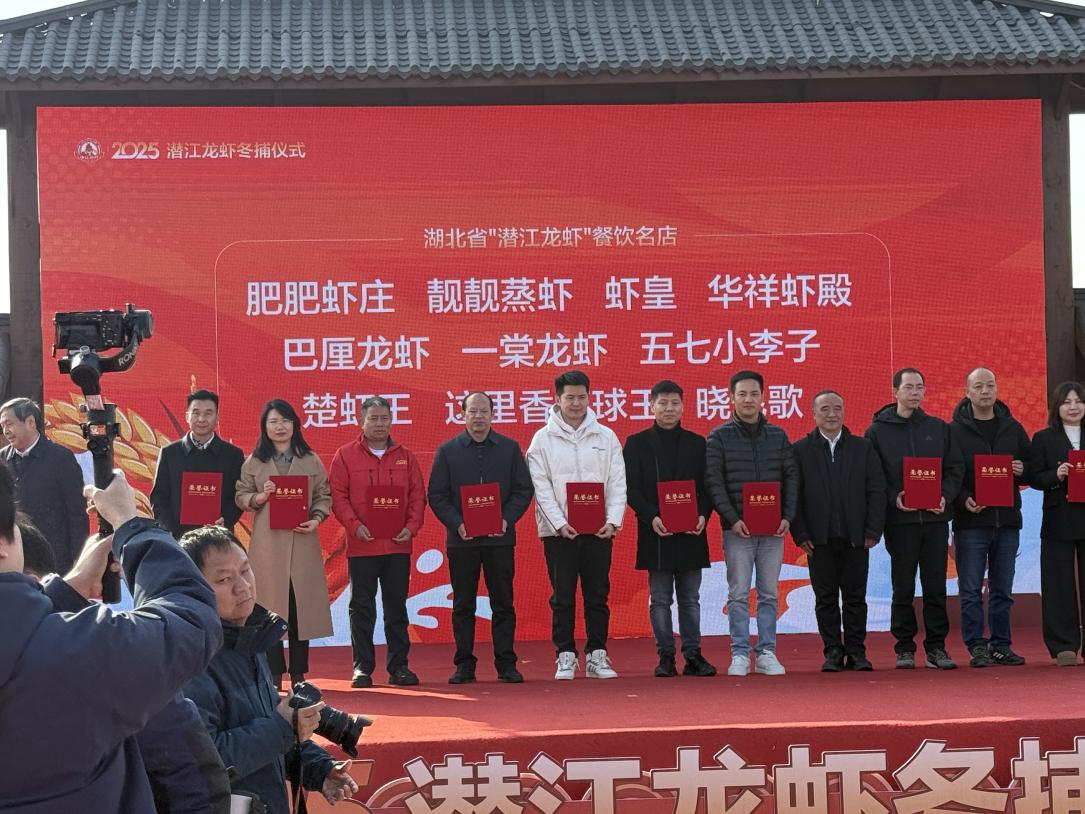 12月26日(星期五)上午9:30,一场火热的冬捕盛宴在龙湾镇郑家湖四季有虾养殖基地隆重开启——“潜江龙虾冬捕仪式”拉开帷幕!省商务厅、省烹协现场为全省十家优质餐饮企业授予“湖北十大小龙虾餐饮品牌”奖牌。